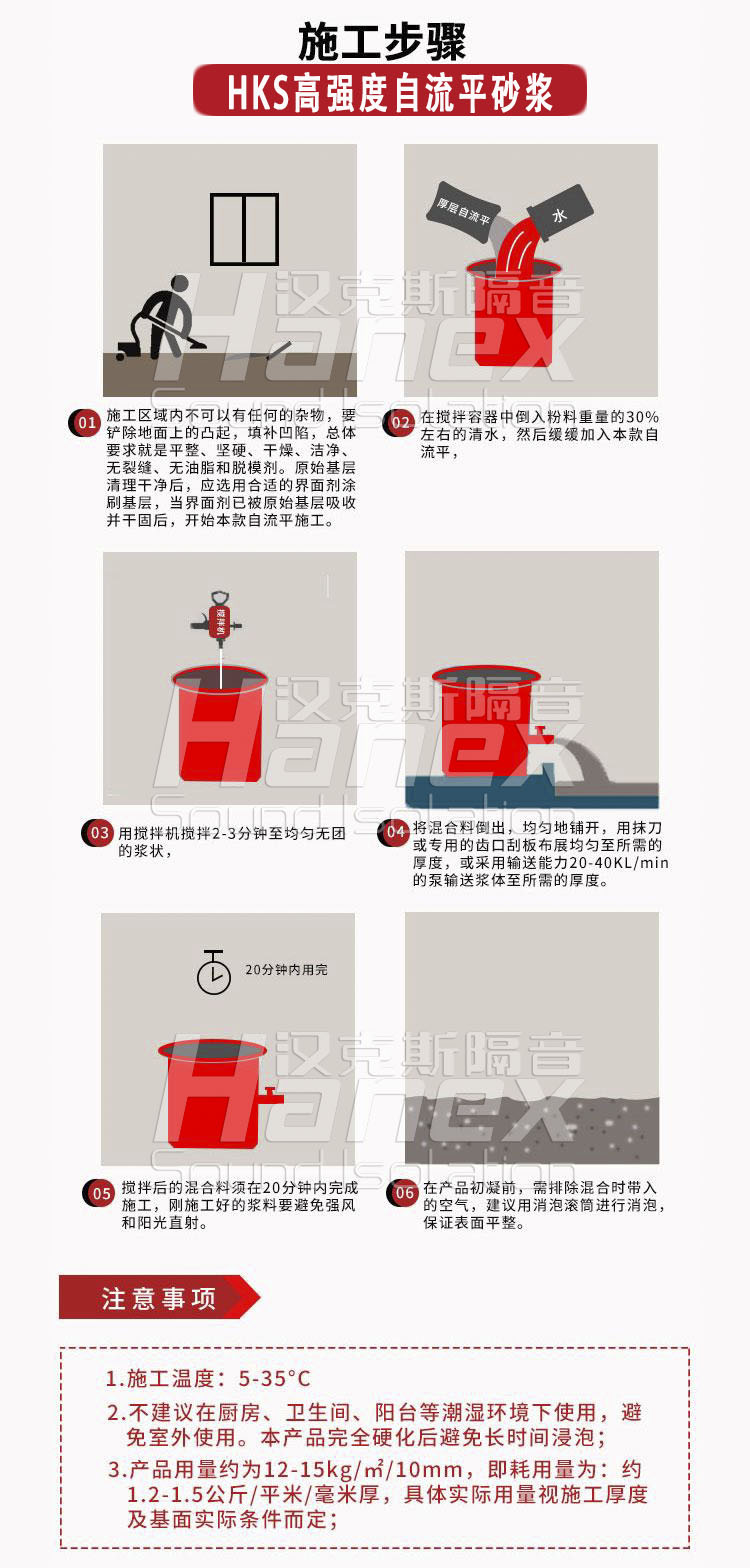 1.自(zì)流平砂漿加(jia)水量為35+2%,無需(xu)添加其他任(ren)何成份,先将(jiāng)水放✌️入攪拌(bàn)桶,再倒入自(zì)流平砂漿,用(yong)電動攪拌器(qi)攪拌2-5分⛹🏻♀️鐘,應(yīng)充分攪拌♍均(jun)勻